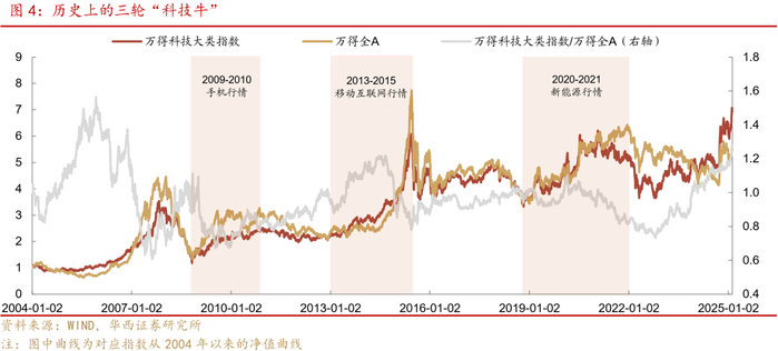 十五五规划建议对科技产业的重视,意味着科技仍将是政策重点支持的方向。回顾此前的五年规划,重点提及的领域均能取得明显进展,且能够映射到板块行情。具体而言,十二五规划重点提到“新一代信息技术产业重点发展新一代移动通信、下一代互联网”,对应2013-2015年的移动互联网行情。十三五规划的建议将新能源列为支持发展的新兴产业和要加快突破的核心技术,并提出“实施新能源汽车推广计划”;十四五规划和二〇三五年远景目标的建议继续将新能源列为战略性新兴产业,对应2019-2021年的新能源行情。此外,十四五规划和二〇三五年远景目标的建议将人工智能列为瞄准的前沿领域,并提到推动其与各产业深度融合,对应2024-2025年的AI行情。