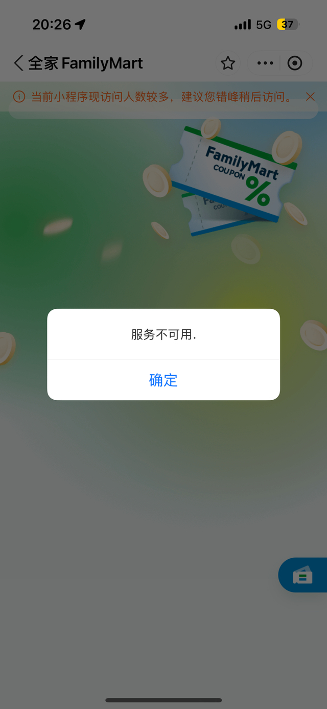 记者现场尝试通过微信与支付宝进入“全家会员小程序”,页面置顶却显示一行提示:“当前小程序访问人数过多,建议您错峰后访问。”反复刷新后,界面仍跳出“服务不可用”的报错信息,优惠券领取入口始终无法加载。