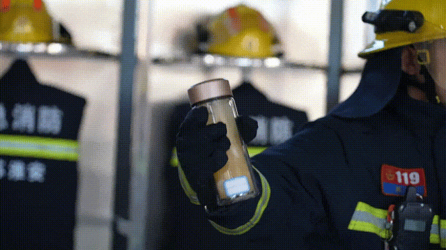 消防员在保温杯内倒入热水,加入红枣、枸杞。摇晃一段时间后,保温杯内有大量小气泡产生。