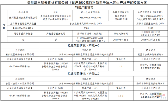 置换方案显示,贵州凯里瑞安建材有限公司原2500t/d水泥熟料线出让1000t/d至本公司另一条2#2500t/d水泥熟料线,补充后产能为3500t/d,置换比例1:1;出让剩余1500t/d产能至台泥(安顺)水泥有限公司4000t/d水泥熟料线,补充后产能为5000t/d,置换比例1.5:1。