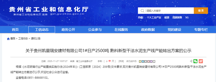 11月27日,贵州省工信厅发布“关于贵州凯里瑞安建材有限公司1#日产2500吨 熟料新型干法水泥生产线产能转出方案的公示”。