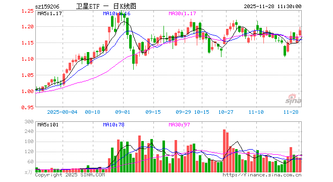 11月28日,截止午间收盘,卫星ETF(159206)涨1.63%,报1.187元,成交额9787.50万元。卫星ETF(159206)重仓股方面,睿创微纳截止午盘涨0.97%,航天电子涨1.21%,中国卫星涨2.08%,复旦微电涨0.42%,上海瀚讯涨0.57%,中兴通讯跌0.64%,华力创通涨3.43%,电科芯片跌2.02%,隆盛科技涨3.45%,振芯科技涨3.25%。
