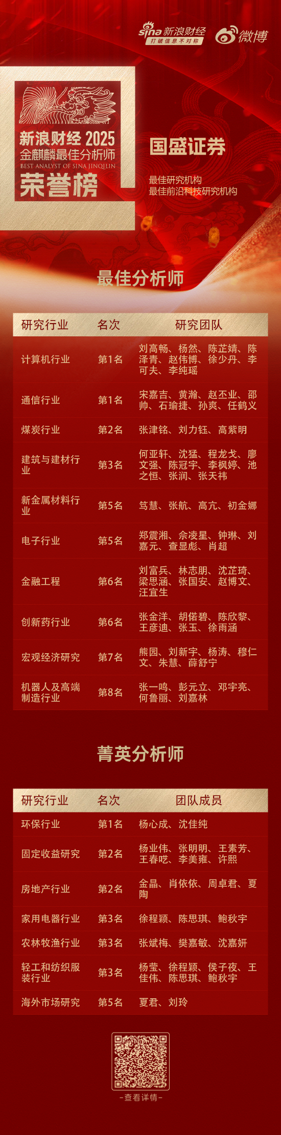 11月28日,第七届新浪财经金麒麟最佳分析师评选结果揭晓,国盛证券研究团队荣获“最佳研究机构第九名”、“最佳前沿科技研究机构第三名”。