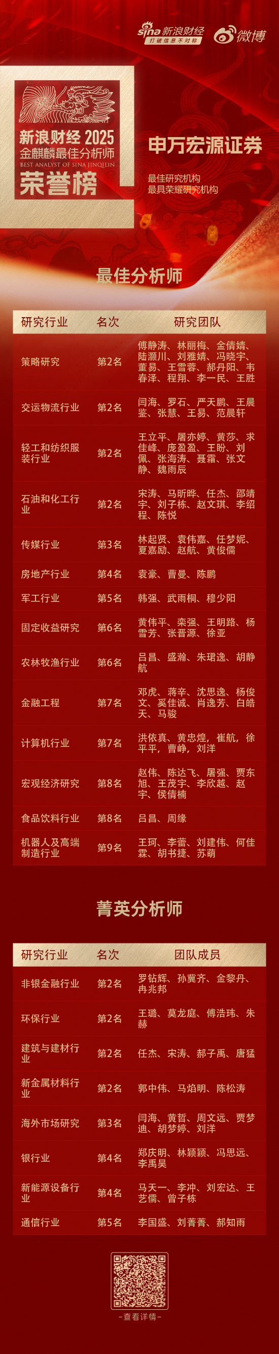 申万宏源证券荣获“第七届新浪财经金麒麟最佳分析师评选”24项大奖