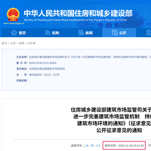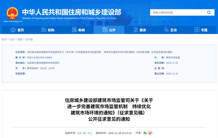 刚刚,住房城乡建设部建筑市场监管司发布关于《关于进一步完善建筑市场监管机制 持续优化建筑市场环境的通知》(征求意见稿)公开征求意见的通知( 建司局函市〔2025〕163号)。