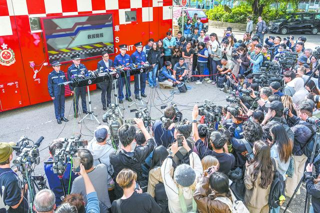28日下午,香港特区政府保安局、消防处、警务处负责人在大埔宏福苑火灾现场召开救援简报会。保安局局长邓炳强称,宏福苑火灾事故已造成128人遇难。 (视觉中国)