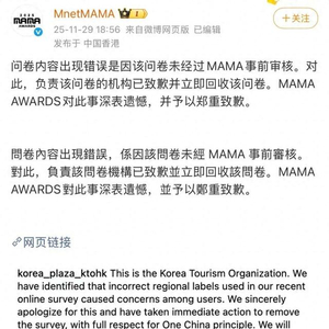 问卷内容出现错误是因该问卷未经过MAMA事前审核。对此,负责该问卷的机构已致歉并立即回收该问卷。MAMA AWARDS对此事深表遗憾,并予以郑重致歉。