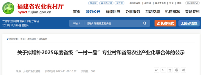 福建省农业农村厅发布公示