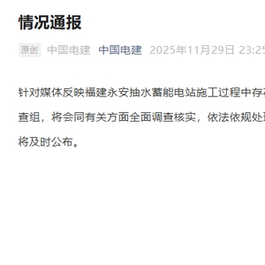 中国电建表示,针对媒体反映福建永安抽水蓄能电站施工过程中存在的质量等问题,中国电建高度重视,已成立调查组,将会同有关方面全面调查核实,依法依规处理。公司真诚感谢社会各界监督,相关调查结果将及时公布。