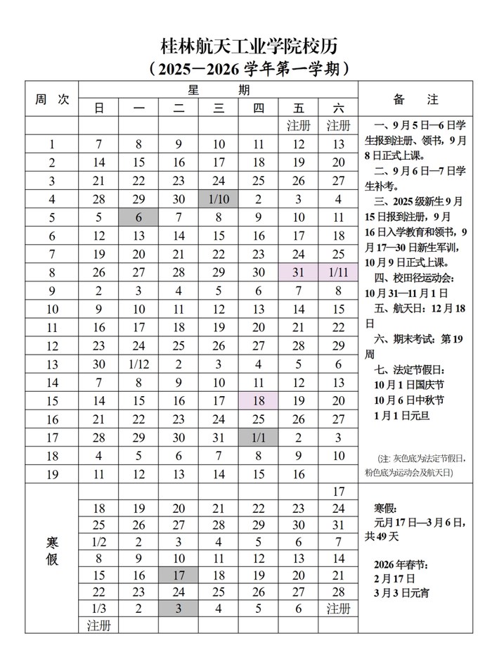 桂林航天工业学院寒假时间:2026年1月17日至3月6日,共49天。