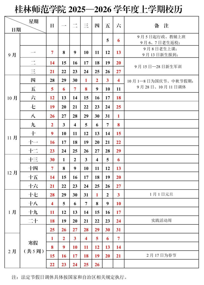 桂林师范学院2025~2026学年寒假放假5周,从2026年1月24日至2月26日。