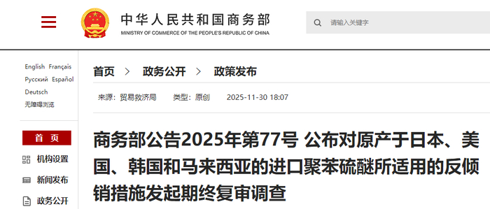 11月30日,商务部发布2025年第77号公告,公布对原产于日本、美国、韩国和马来西亚的进口聚苯硫醚所适用的反倾销措施发起期终复审调查。