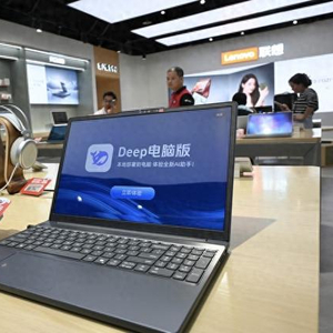 2025年11月23日,中国深圳:2025年11月23日,深圳某商店展示联想笔记本电脑中运行的深度求索AI程序。 IC Photo