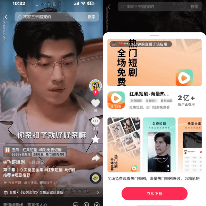 但光靠免费还不够,要把商业闭环打通,流量入口必不可少。红果从一开始就借助字节跳动生态的优势,通过抖音搜索弹窗、剧情切片“一键跳转”等方式,实现高效引流,把抖音里约 1.19 亿重合用户吸引到红果来看短剧。