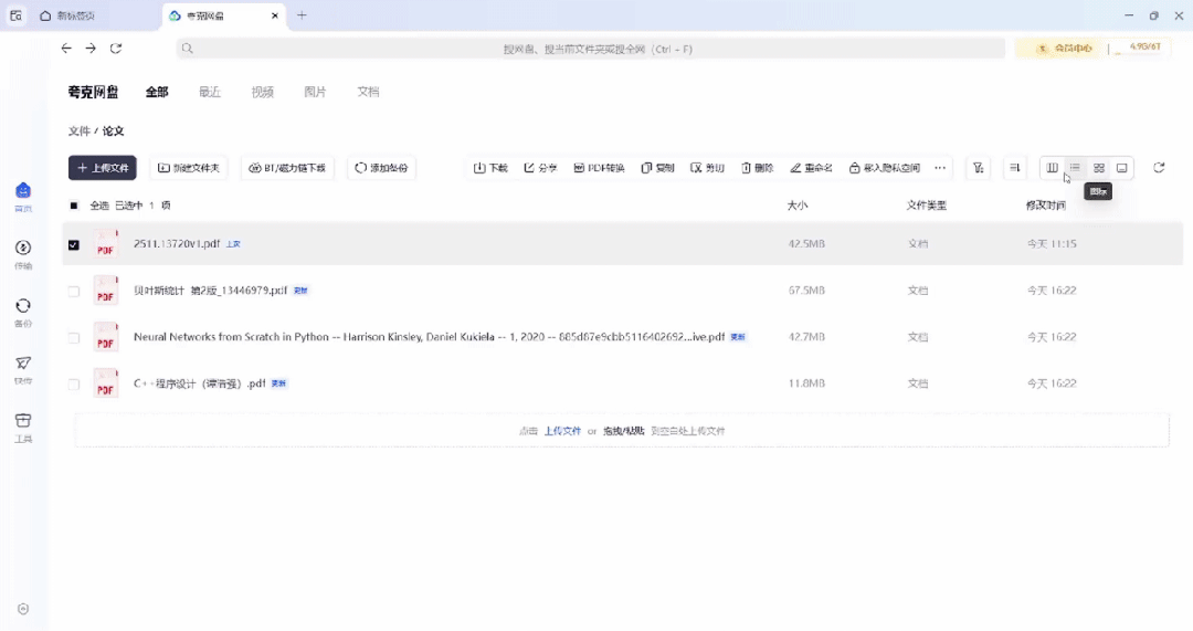 在浏览资料时,夸克独家的分栏模式发挥了巨大作用。它支持「左边看列表、右边预览内容」,不仅还原了本地资源管理器的体验,更避免了频繁「打开 - 关闭」文件夹的繁琐操作。