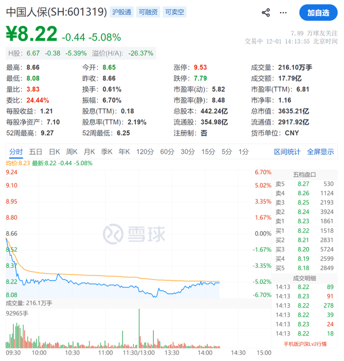 12月1日,在保险板块整体上涨的A股和港股市场,人保相关股票跌幅明显,A股中国人保跌超5%,港股中国人民保险集团、人保财险均一度跌超6%。