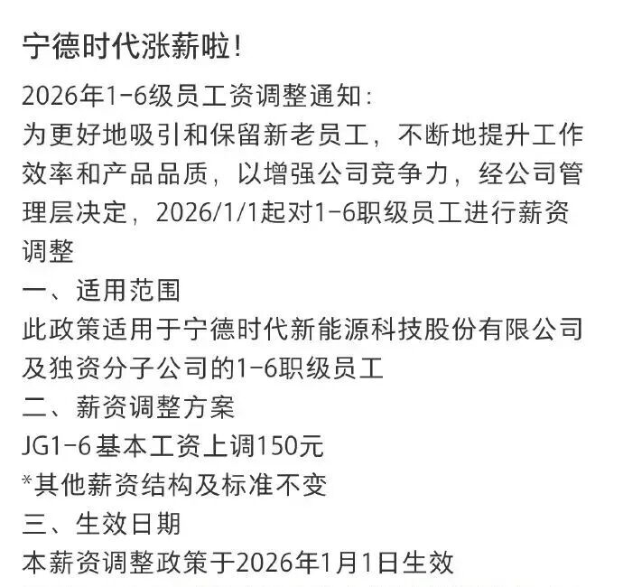 根据流传出的《2026年1-6级员工资调整通知》,此次调薪覆盖宁德时代及其全资子公司范围内职级为1至6级的全体员工。具体调整方案为:JG1至JG6职级员工的基本工资每月统一上调150元,其他薪资结构及标准不变。该政策将于2026年1月1日正式生效。据了解,此次宁德时代涨薪主要针对一线蓝领员工的底薪,加班收入也会同步提高。调整后,按每周休息一天计算,产线员工月综合收入可达7500元左右。这一调整是在公司业绩持续向好的背景下实施的。2025年前三季度,宁德时代营收达2831亿元,同比增长9.28%;归母净利润490亿元,同比增长36.20%。值得一提的是,今年9月有网友爆料宁德时代员工9级升到10级涨薪超过10%。