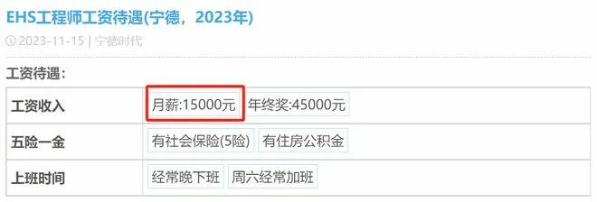 网络上也有一些宁德时代员工爆料的工资待遇,一位宁德时代的EHS工程师,月薪是15000元,年终奖4.5W。