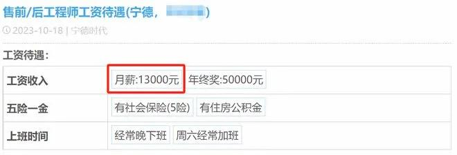 一位宁德时代的售前/后工程师,月薪是13000元,年终奖5W。