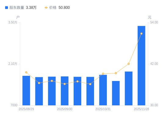 近一年(2024年11月29日至2025年11月28日),久之洋A股股东户数从1.51万户,增加至3.38万户,增幅123.83%,区间股价上涨40.68%。