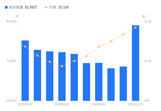 近一年(2024年12月20日至2025年11月20日),隆基绿能A股股东户数从82.05万户,增加至82.88万户,增幅1.01%,区间股价上涨20.94%。