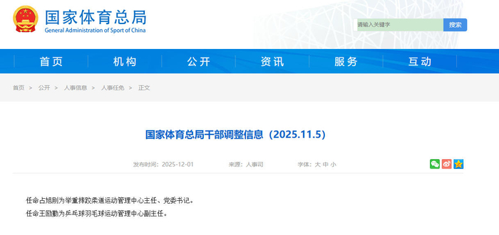 任命占旭刚为举重摔跤柔道运动管理中心主任、党委书记。