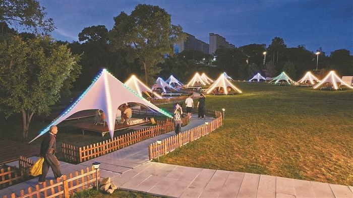 生态休闲场景不断升级。今年7月8日,工农区精心打造的天水湖公园露营地正式免费开放,作为2025年夏季公园内“微度假”场景的创新尝试,营地通过“免费预约+轻装备”的模式,为市民增添了一片“触手可及的自然休憩地”。营地坐落于公园绿植环绕的缓坡区域,50个木质平台沿林带与草坪带状排布,18个配备防水天幕,32个为开放式平台,青石板路串联其间保留野趣,栅栏轻围界定区域又不挡视线。开放首日预约即满,市民无需携带复杂装备,就能体验“说走就走”的松弛感。7月12日晚,天水湖草坪音乐会在露营地启幕,为全市居民带来精彩的视听盛宴。