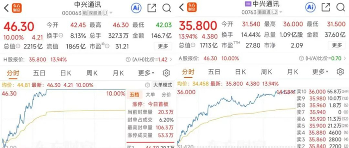 受此消息影响,中兴通讯(000063)A股12月1日股价高开高走,最终封住涨停板,报收46.3元/股,港股中兴通讯同样大幅上涨,最终收报35.8港元/股,涨幅13.94%,公司最新总市值已达到2111亿元。