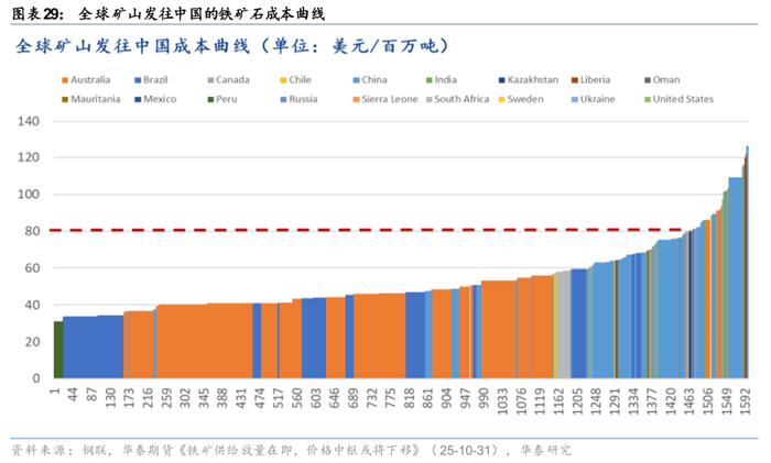 根据钢联测算的全球矿山发往中国的成本曲线分析,90至120美元的价格区间对应约0.66亿吨铁矿石供应。据华泰期货《铁矿供给放量在即,价格中枢或将下移》(25-10-31);若以95美元作为2026年度均价进行测算,高成本非主流矿山将较今年进一步减少发往中国的量,这将对铁矿石形成一定支撑,致使其价格下跌空间有限。2026年铁矿石价格运行中枢或在95-105美元/吨。