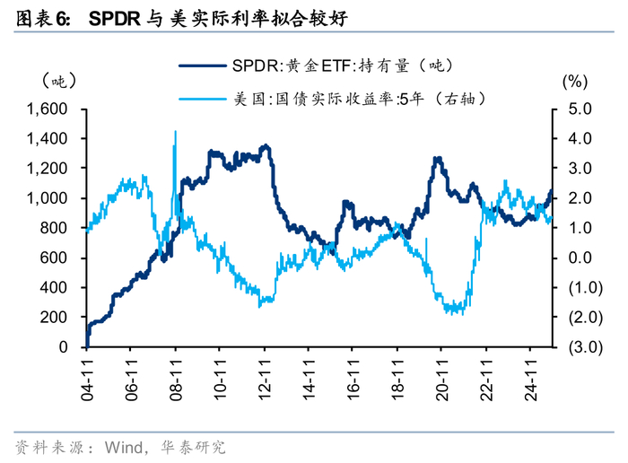 2026年美国实际利率或是下行趋势,叠加美元震荡走弱,利于金价进一步上行。华泰宏观认为2026年美国流动性将持续宽松(降息和宽财政并举),帮助美国实际GDP增速从2025年2.0%升至2026年2.3%(华泰宏观《不均衡的经济“再加速”——2026美国宏观展望》,2025-11-03);与此同时,核心通胀预期提升至3.3%,高于2025年的3.0%;2026年实际利率下行是大概率事件。