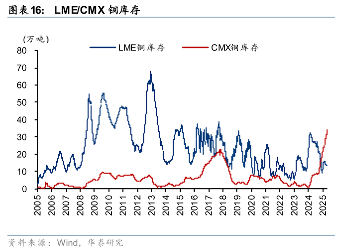 2025年,铜价抬升的原因之一是美国囤库。2025H1,市场担心美国对铜征收关税后美国将出现铜供不应求的状况,CMX铜大幅上涨,相对LME铜出现明显溢价;进口套利窗口打开后,铜向美抢运行情带动LME/SHFE铜上涨。8月1日,美国实施铜关税,仅对铜深加工产品实施关税、原料豁免。截至11月21日,CMX相对LME仍有0-5%的溢价,我们认为或是市场担忧未来某一时点美国仍有可能对铜原料征收关税。截至11月20日,CMX铜较2024年底累库28万吨,且仍在持续累库。