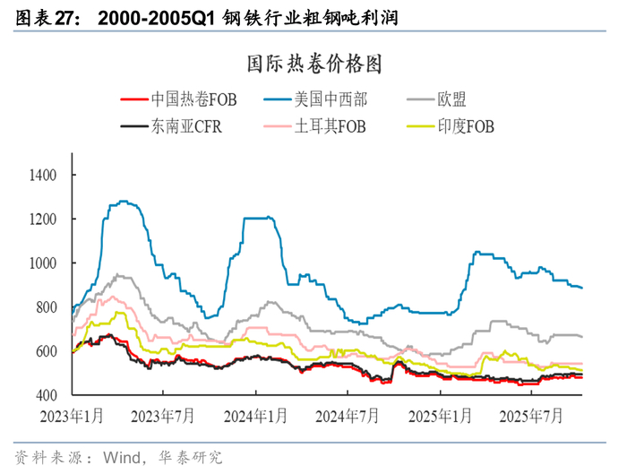 粗钢供给侧,自2015年开启供给侧改革后,2020年中国粗钢产量和内需同时见顶;随后进入减产周期,2020-2024年粗钢减产CAGR -1.43%。2024年中国政府持续强调相关行业反内卷,2025.1-9月中国粗钢同比下降2.9%,但内需下降幅度更大,国内钢铁供需格局进一步恶化,吨粗钢利润仍处于低位。我们预期2026年国内粗钢产量或进一步下降,我们预期降幅或为1.5-2%。