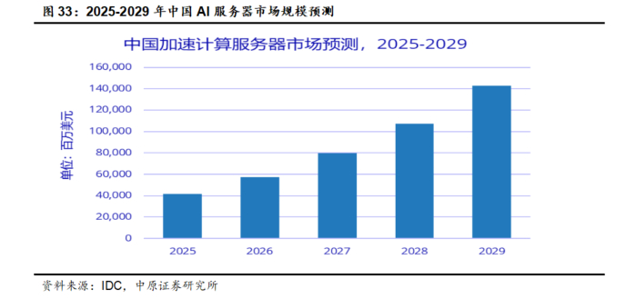 互联网厂商作为AI服务器的需求方,其需求占比有集中化趋势。根据IDC在10月发布的数据,2025上半年,我国AI服务器市场规模达到160亿美元,较2024H1增长超过1倍。同时,IDC预计到2029年,我国加速服务器市场规模将超过1400亿美元,这一规模将其3月的预测值提升了约400亿美元。从行业格局来看,互联网厂商在AI服务器需求占比从2024H1的60%提升到了69%,对市场的主导性在持续增强。