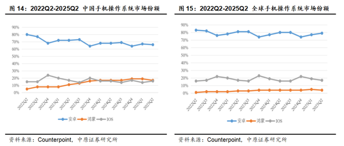 当前鸿蒙已经成为中国第二和全球第三大手机操作系统。根据Counterpoint的数据,2025Q2鸿蒙份额17%,连续6个季度位居国内手机操作系统第二名,同时鸿蒙在全球继续占据4%的市场份额,位居全球第三。