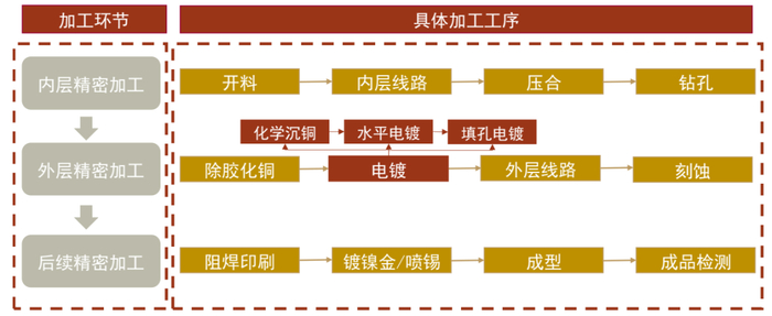 PCB(Printed Circuit Board):即印制电路板,即采用电子印刷术制作的、在通用基材上按预定设计形成点间连接及印制组件的印刷板。PCB的主要生产流程包括:开料、压合、钻孔、电镀、蚀刻、阻焊印刷等环节。其中电镀环节是通过电解原理在PCB基材表面沉积均匀、致密、结合良好的金属或合金层的过程。