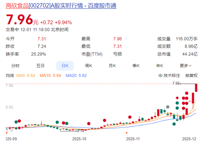 据交易所数据显示,海欣食品连续四个交易日涨停,晋级4连板。该股今日于9:38封涨停,截至发稿,海欣食品报收7.96元/股,市值44.24亿元。