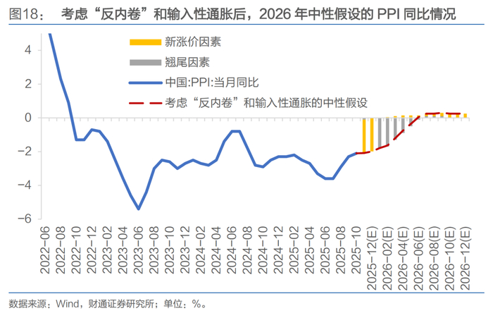 考虑输入性通胀以后,在中性预期下,预计到 2026 年 12 月,PPI 同比增速将回升到 0.2%,全年中枢约为-0.4%。节奏上前低后高,2026 年 6 月前后 PPI当月同比有望转正。