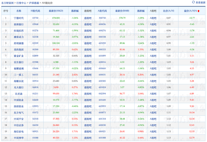 公开信息显示,AH股价格“倒挂”的6家公司分别是:宁德时代、招商银行、恒瑞医药、潍柴动力、药明康德、美的集团;AH股价格比较贴近的则有紫金矿业、民生银行、福耀玻璃、三一重工、海螺水泥、比亚迪等。