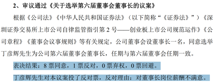 但在选举第六届董事会董事长的议案中,公司同意选举丁彦辉为公司第六届董事会董事长。对此,丁彦辉投了1票反对,反对理由是对董事长岗位薪酬不满意。