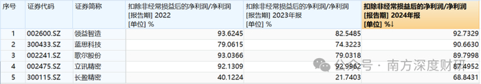 就扣非净利率情况来看,公司的净利率在2024年实现大幅提升,但这个水平在五家公司中处于中等水平,低于蓝思科技(4.70%)和立讯精密(4.35%)。这反映出长盈精密在期间费用的控制方面,与头部公司相比仍有提升空间。