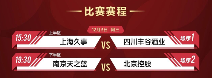 上海久事与四川丰谷酒业的比赛将于12月3日下午15:30打响,这场比赛是B组上半区循环赛的开局之战。