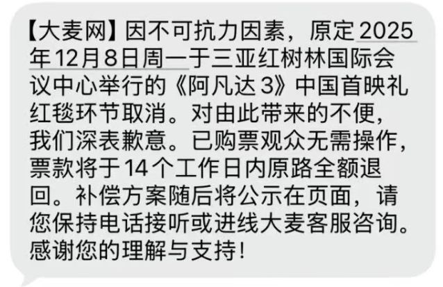 不过,有网友表示突然收到了红毯活动取消的邮件通知:“因不可抗力因素,我们非常遗憾地通知您:原定于2025年12月8日(周一)于海南三亚红树林国际会议中心举办的《阿凡达3》中国首映礼红毯环节决定取消。对于活动取消给您带来的不便,我们深表歉意,敬请谅解。”