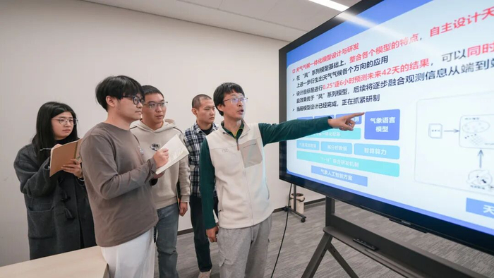11月17日,雄安科学园内,雄安气象人工智能创新研究院首席架构师窦则胜团队成员讨论新一代天气气候一体化AI模型。“这里不仅提供具有竞争力的薪酬,更重要的是提供了一个能让我专注研究的平台。”窦则胜说,人工智能在气象领域正迎来爆发期,是一个值得长期投入的方向。