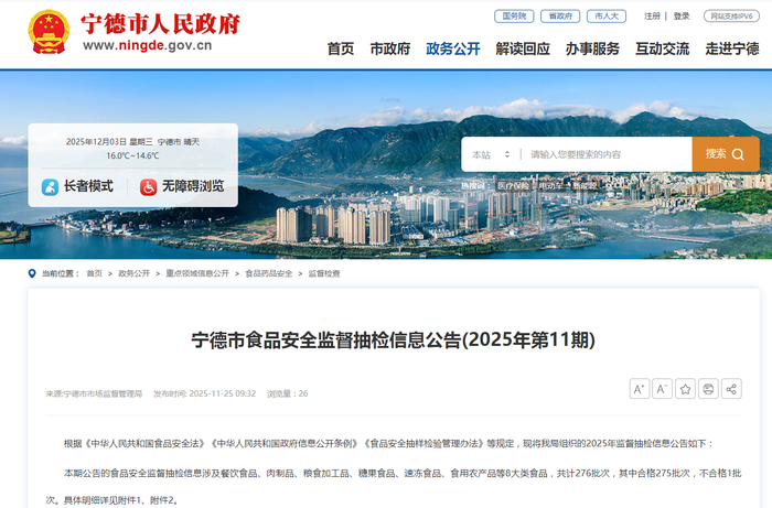 福建省宁德市食品安全监督抽检信息公告(2025年第11期)