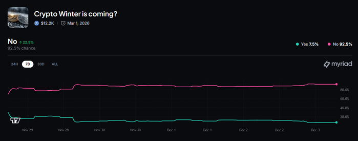 根据链上预测平台Myriad一项关于“加密货币市场是否会出现寒冬”的调查显示,仅有7.5%的用户持有悲观态度,这一比例较上周五(11月28日)的30%有所下降。