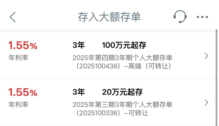 记者从工商银行官方渠道核实了解到,今年5月20日,工商银行同步发行了2025年第三期、第四期两款3年期大额存单产品。所谓“起售门槛提至100万”的3年期大额存单,是工行今年发行的第四期大额存单产品,产品定位面向“高端”客户;而第三期产品则维持行业主流的20万元起存标准,两款产品的年利率均为1.55%。