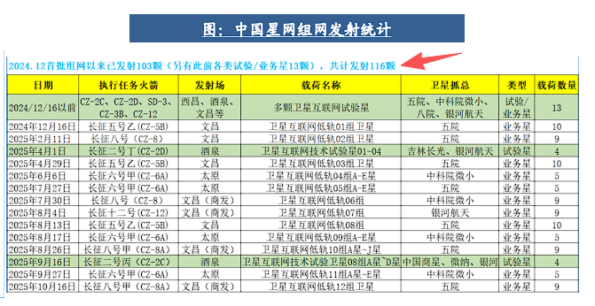 截至2025年10月,中国星网累计发射116颗卫星(含实验星和业务星),千帆累计发射组网卫星数达到108颗。尽管与Starlink相比仍有差距,但发射频率正在"日常化"。