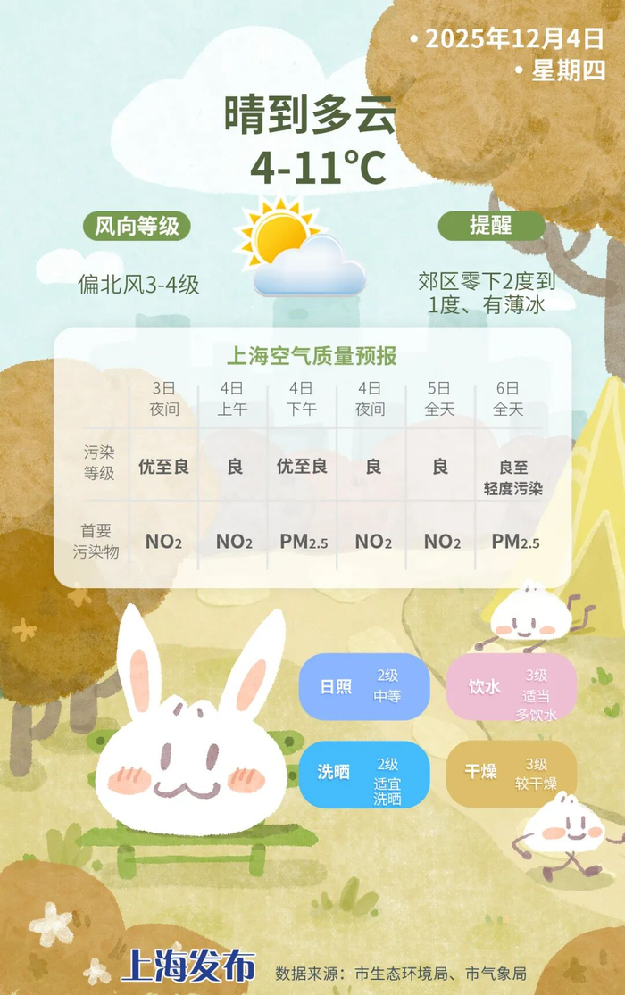 今受辐射降温影响,明天早上为本轮冷空气过程的气温最低点。市区最低气温仅在4度左右,郊区零下2度到1度,有薄冰。白天是晴到多云的天气,最高气温11度。风力减小,偏北风3-4级,相对湿度75%-25%。明日天气提示:白天升温不明显,注意保暖。空气干燥,及时补水,注意用火用电安全。