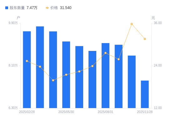 近一年(2024年11月29日至2025年11月28日),信维通信A股股东户数从9.73万户,减低至7.47万户,降幅23.31%,区间股价上涨25.85%。
