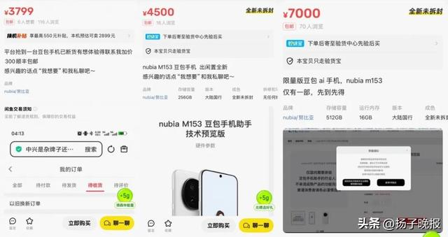 在二手平台,有用户称“在官网抢到一台‘豆包’手机,加价300可顺丰包邮”;也有人以高达7000元的价格转让,溢价3500元,目前有70人浏览。其他二手努比亚M153溢价后的价格大部分在4000元到4500元之间。